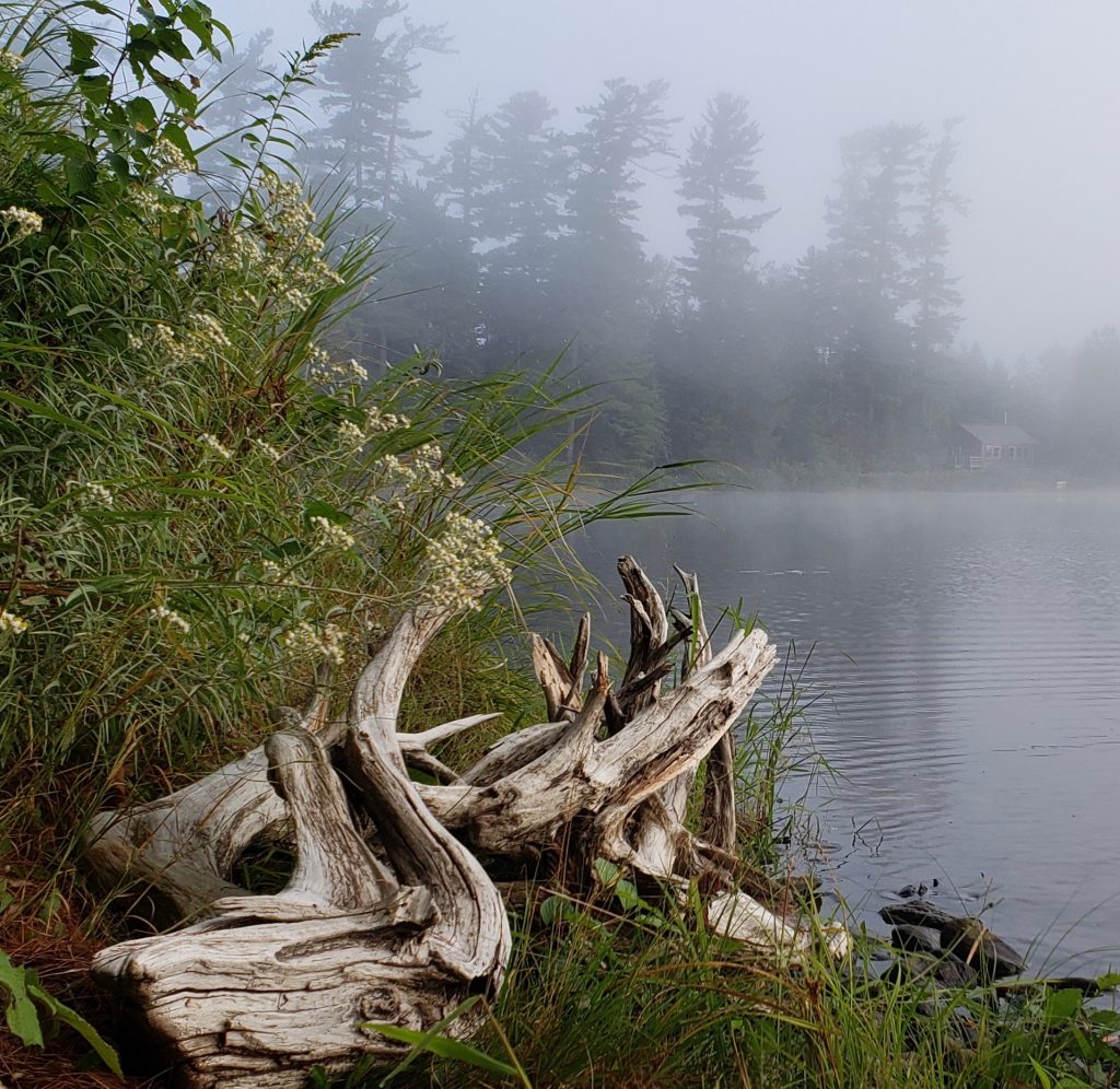 This photo was taken on August 11th 2018 at Arnold Pond, ME. That was my reward for getting up early. The photo was taken with my phone, a Samsung S9. I love taking photos while the nighttime fog is still present. I used the driftwood in the foreground as a leading line. If you look closely, youāll see a log cabin in the upper right corner. This image is not processed. I like the B&W-like contrast with the Color vegetation in the front. The diagonal brings a bit of ” je ne sais quoi ” to the shot.