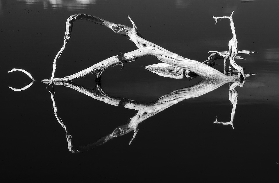 Reflections of dead tree in lake.