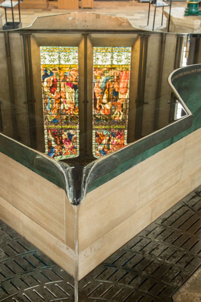 This is a reflection of the stained glass window in the baptismal font in the Salisbury Cathedral in Salisbury, England.