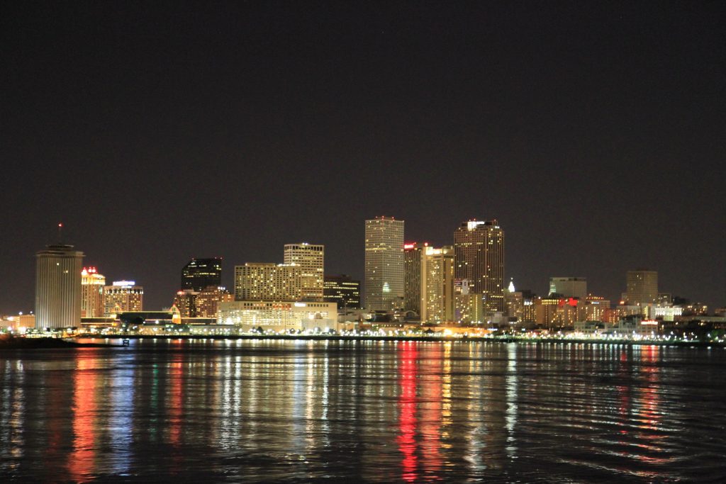 New Orleans from the Riverboat Natchez on an evening cruise. March 2012, Longish exposure from moving boat but it came out OK after a few tries.