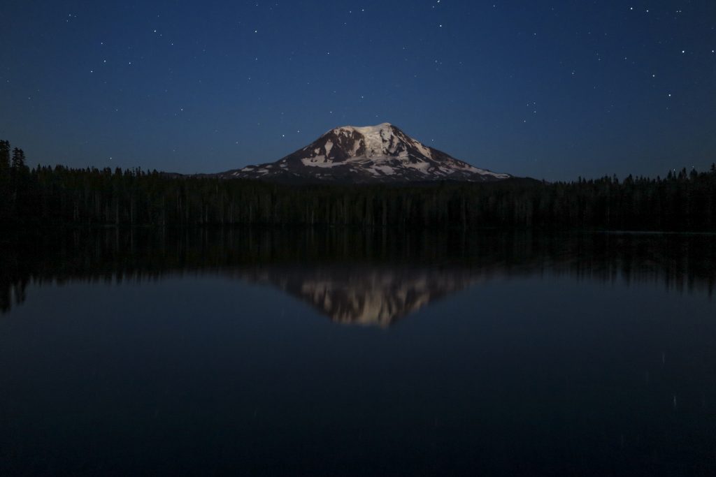 Takhlakh Lake – Mt Adams lit by moonlight. Mt Adams is in Washington State. My hiking website is Adventures with Dotty –Ā https://adventureswithdotty.com/Ā 1